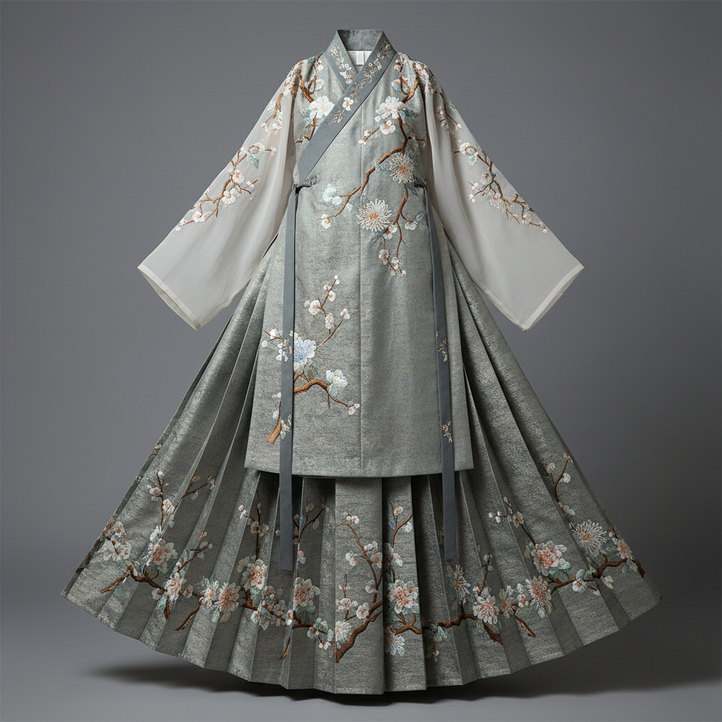 面向当代穿着场景的馆藏级作品,强调廓形与面料肌理;以折枝花卉为文化锚点,采用苏绣呈现细节,来自苏州工艺语汇,寓意“生机与丰收”。
