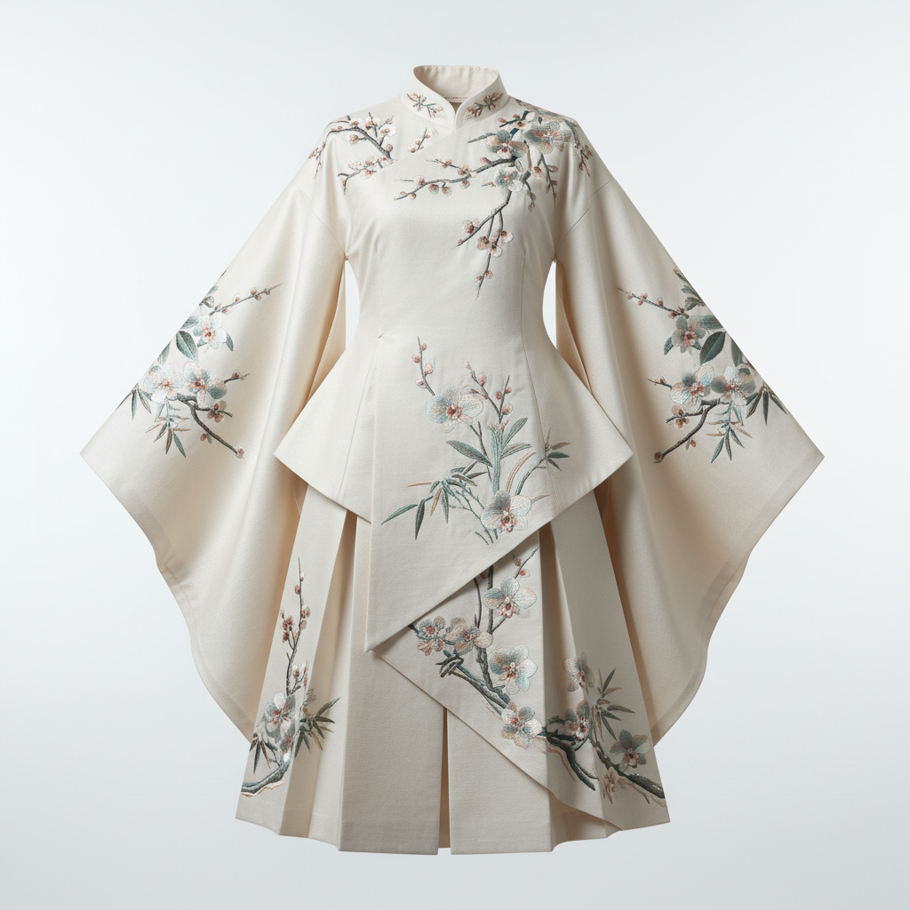 面向当代穿着场景的馆藏级作品,强调廓形与面料肌理;以折枝花卉为文化锚点,采用苏绣呈现细节,来自苏州工艺语汇,寓意“生机与丰收”。