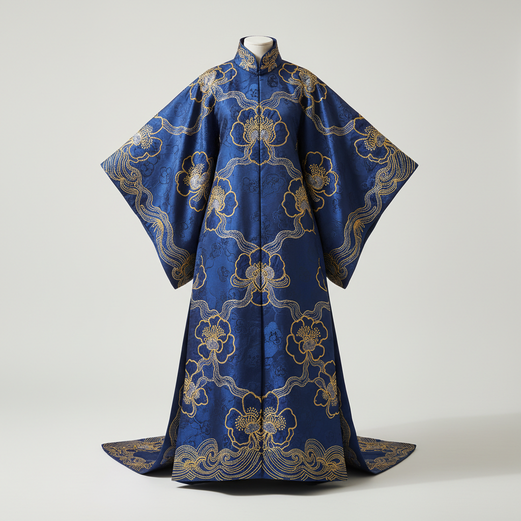 面向当代穿着场景的馆藏级作品,强调廓形与面料肌理;以海棠纹为文化锚点,采用盘金绣呈现细节,来自苏州工艺语汇,寓意“富贵与秩序”。