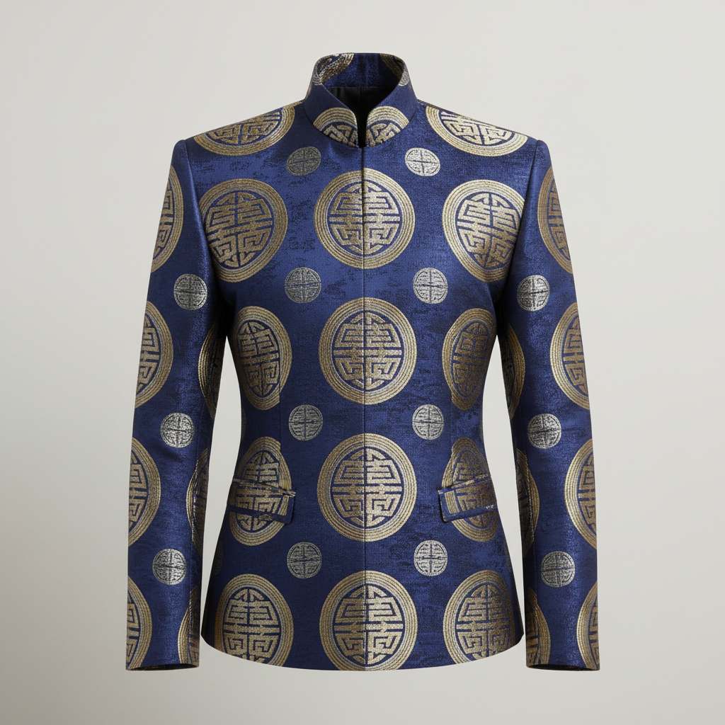面向当代穿着场景的馆藏级作品,强调廓形与面料肌理;以团寿纹为文化锚点,采用缂丝呈现细节,来自南京工艺语汇,寓意“长寿与吉祥”。