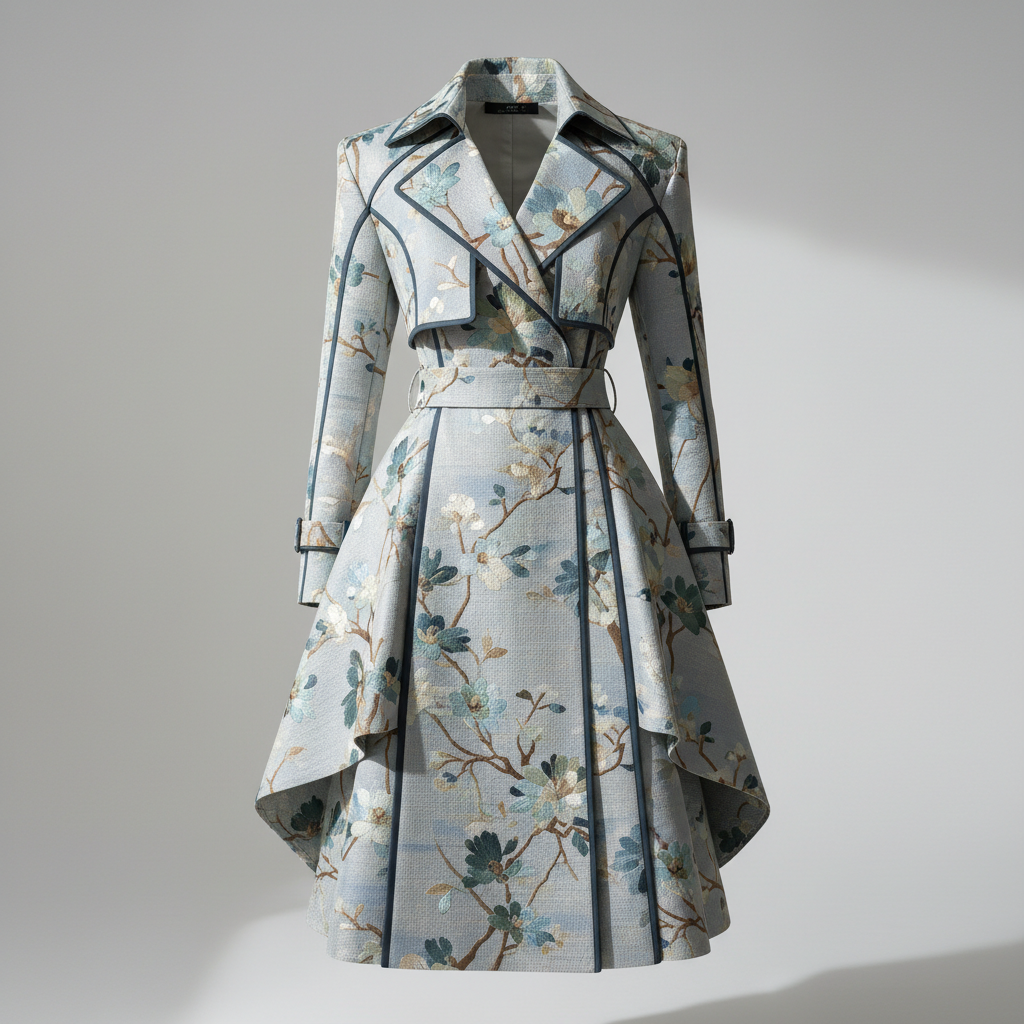 面向当代穿着场景的馆藏级作品,强调廓形与面料肌理;以折枝花卉为文化锚点,采用苏绣呈现细节,来自苏州工艺语汇,寓意“生机与丰收”。