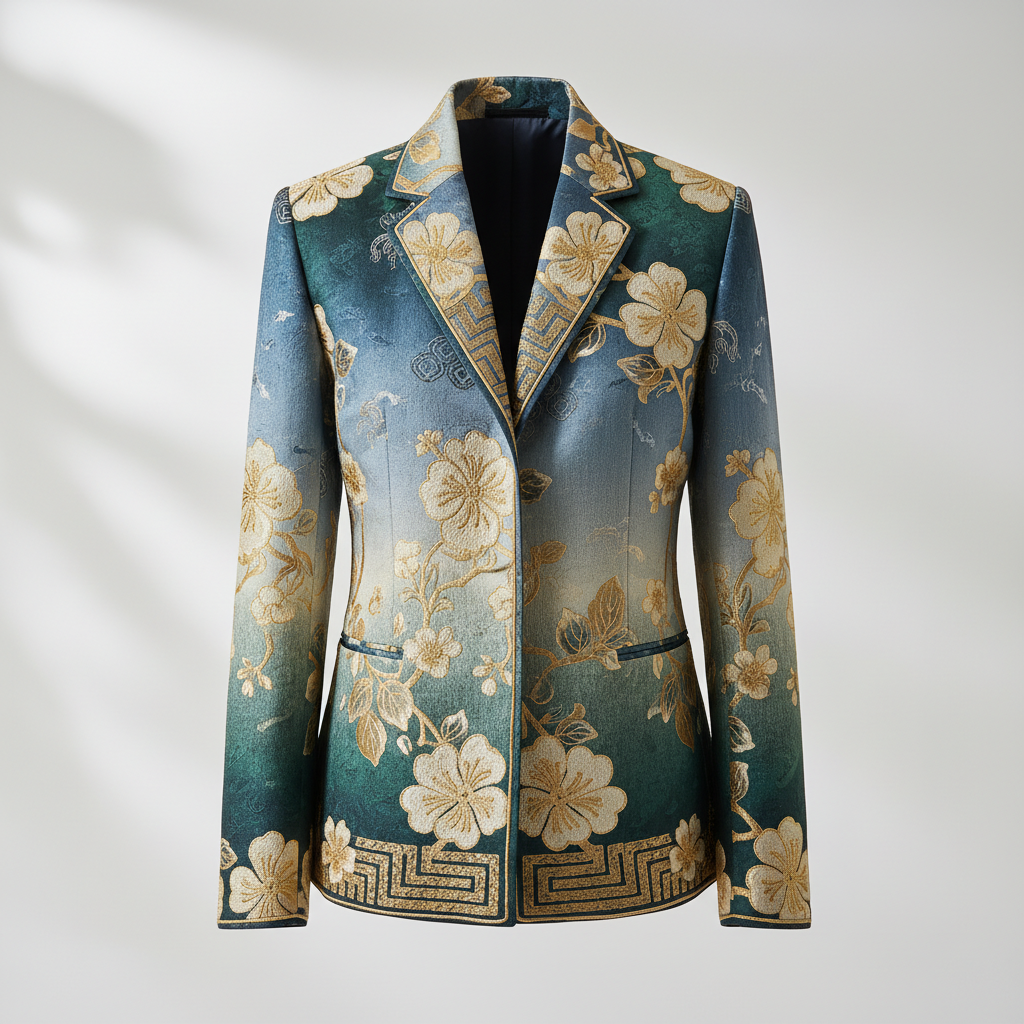 面向当代穿着场景的馆藏级作品,强调廓形与面料肌理;以海棠纹为文化锚点,采用盘金绣呈现细节,来自苏州工艺语汇,寓意“富贵与秩序”。