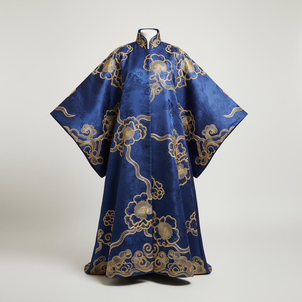 面向当代穿着场景的馆藏级作品,强调廓形与面料肌理;以海棠纹为文化锚点,采用盘金绣呈现细节,来自苏州工艺语汇,寓意“富贵与秩序”。