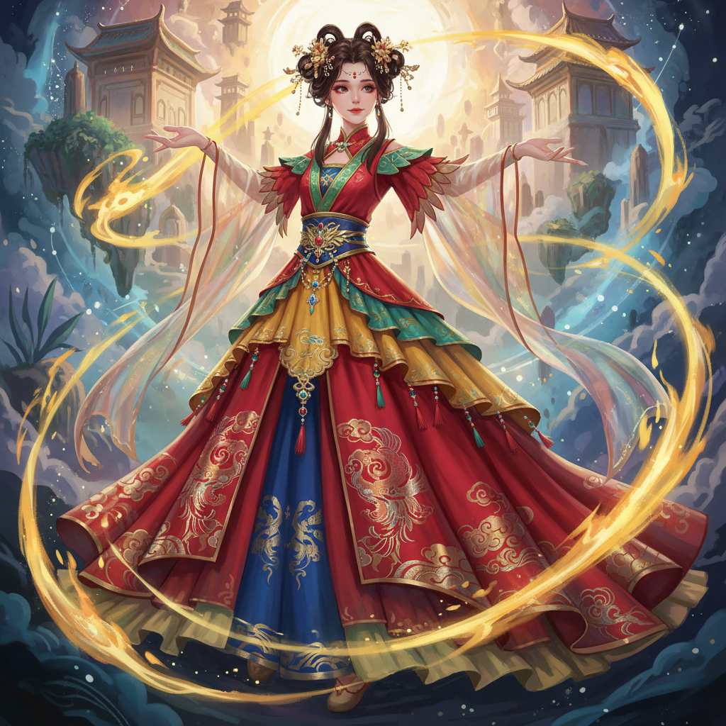 一件融合了魔法少女风格与传统凤凰图腾的华丽礼服。廓形借鉴了唐代服饰的飘逸与华贵,色彩以凤凰的赤红、金黄为主,点缀以青绿和宝蓝。裙摆宽大,层层叠叠,饰有精致的刺绣和流苏。腰部收紧,配有华丽的腰带和宝石装饰。整体设计既有魔法少女的梦幻与活力,又不失东方古典的优雅与庄重,仿佛凤凰涅槃,舞动九天。
