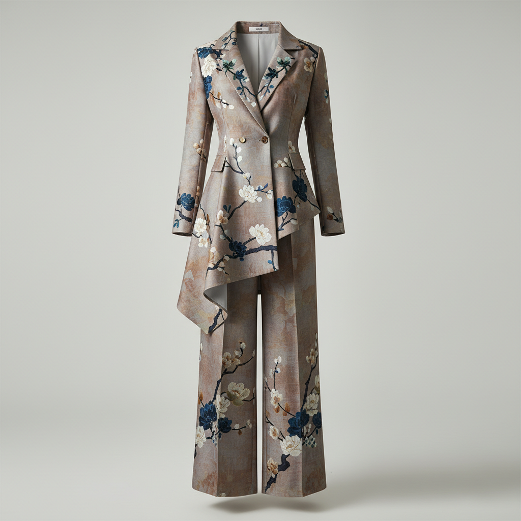 面向当代穿着场景的馆藏级作品,强调廓形与面料肌理;以折枝花卉为文化锚点,采用苏绣呈现细节,来自苏州工艺语汇,寓意“生机与丰收”。