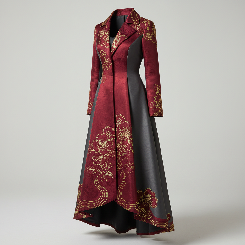 面向当代穿着场景的馆藏级作品,强调廓形与面料肌理;以海棠纹为文化锚点,采用盘金绣呈现细节,来自苏州工艺语汇,寓意“富贵与秩序”。