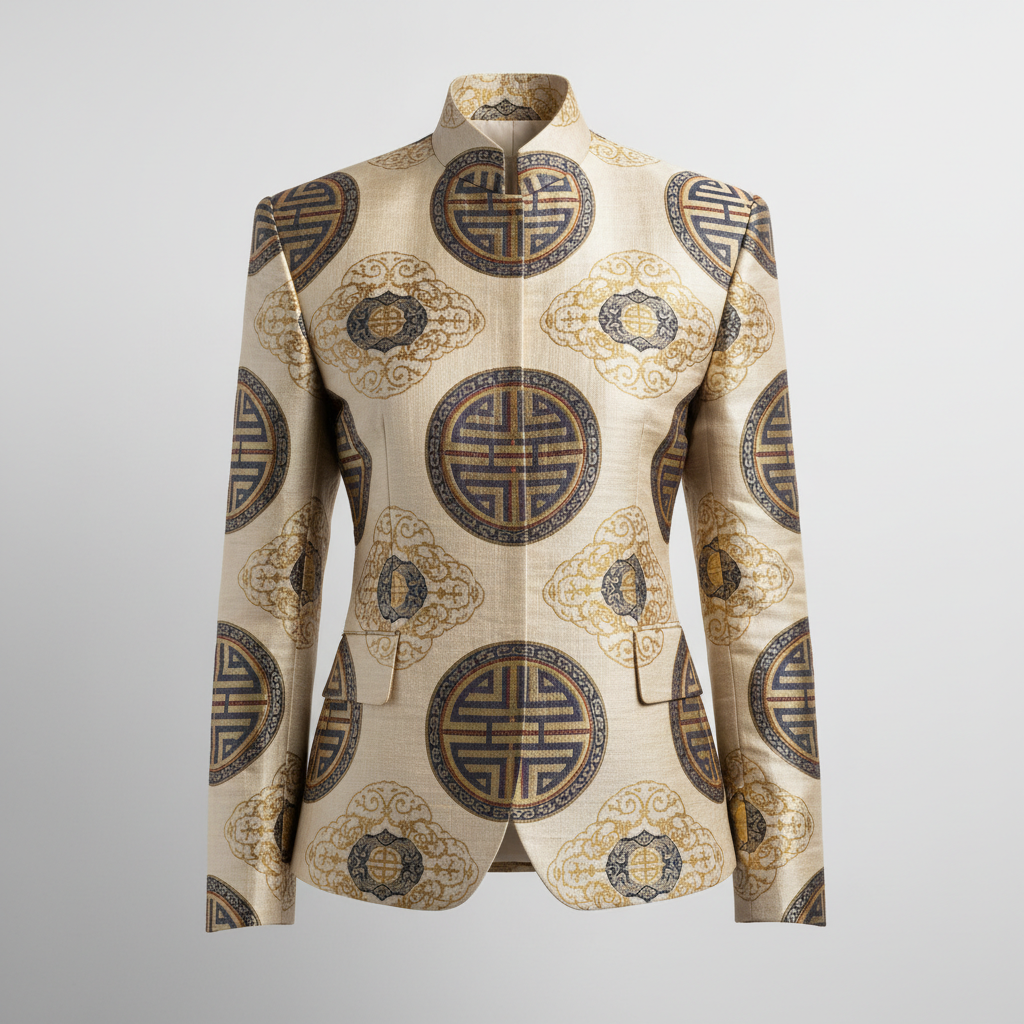 面向当代穿着场景的馆藏级作品,强调廓形与面料肌理;以团寿纹为文化锚点,采用缂丝呈现细节,来自南京工艺语汇,寓意“长寿与吉祥”。