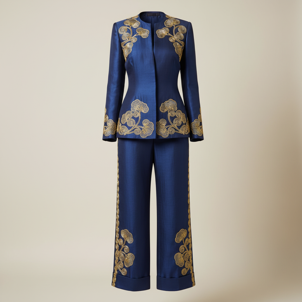 面向当代穿着场景的馆藏级作品,强调廓形与面料肌理;以海棠纹为文化锚点,采用盘金绣呈现细节,来自苏州工艺语汇,寓意“富贵与秩序”。