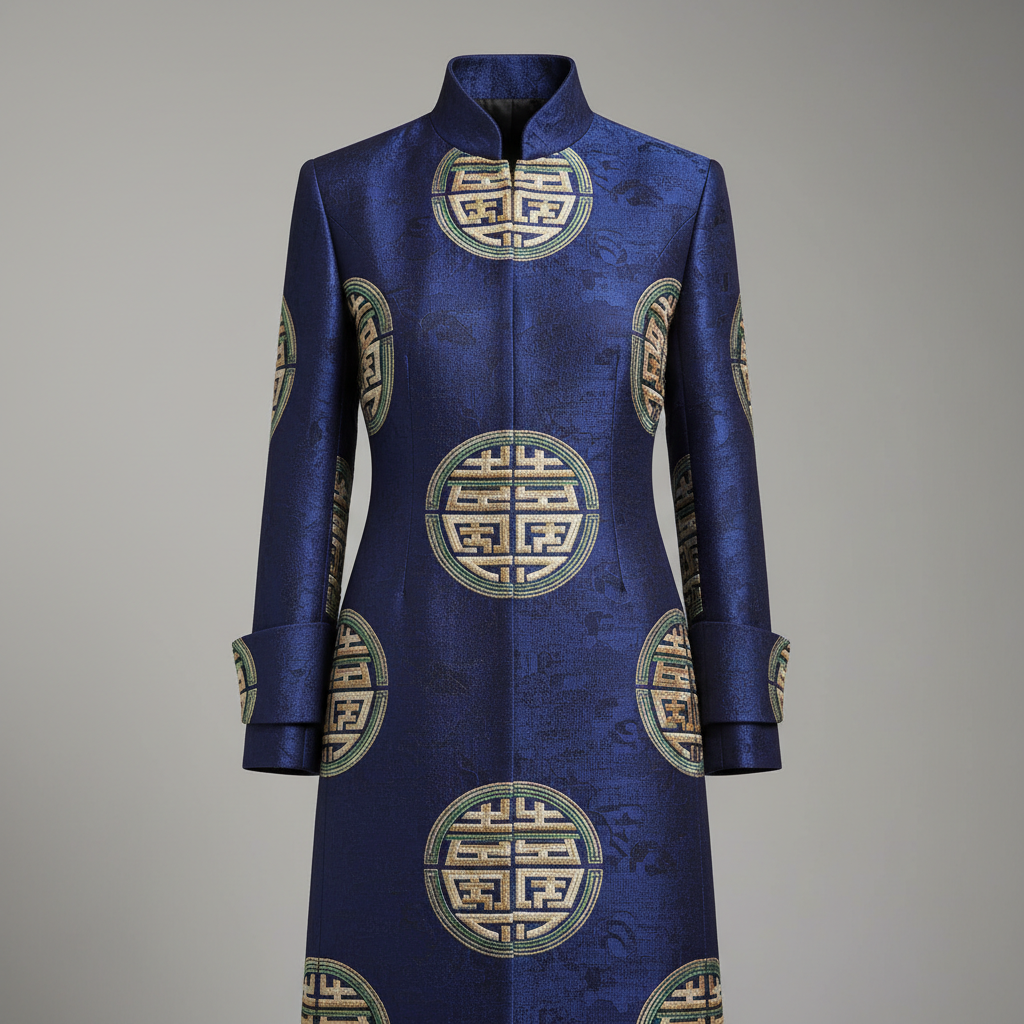 面向当代穿着场景的馆藏级作品,强调廓形与面料肌理;以团寿纹为文化锚点,采用缂丝呈现细节,来自南京工艺语汇,寓意“长寿与吉祥”。