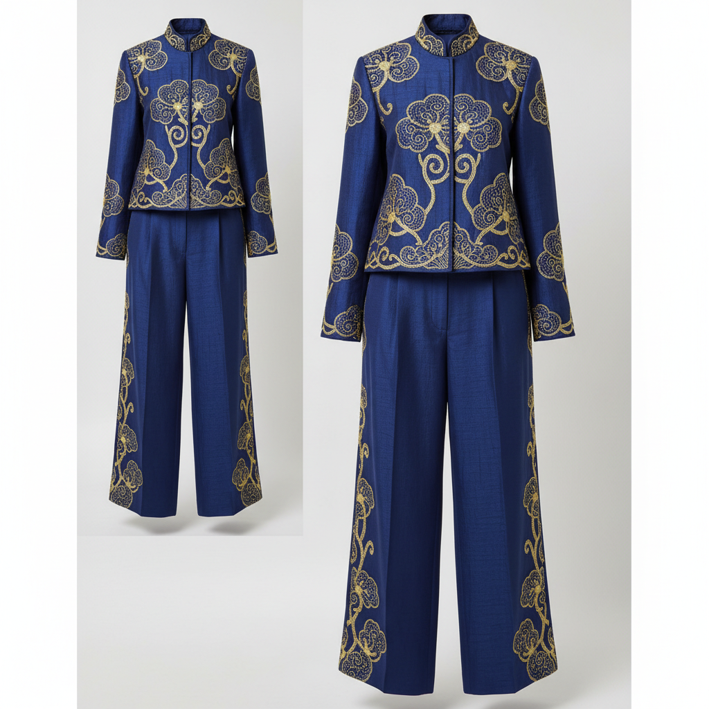 面向当代穿着场景的馆藏级作品,强调廓形与面料肌理;以海棠纹为文化锚点,采用盘金绣呈现细节,来自苏州工艺语汇,寓意“富贵与秩序”。