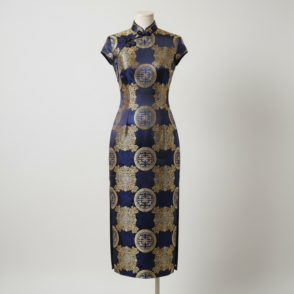 面向当代穿着场景的馆藏级作品,强调廓形与面料肌理;以团寿纹为文化锚点,采用缂丝呈现细节,来自南京工艺语汇,寓意“长寿与吉祥”。