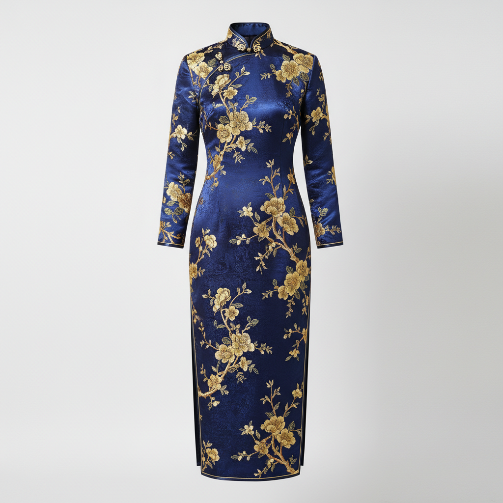 面向当代穿着场景的馆藏级作品,强调廓形与面料肌理;以海棠纹为文化锚点,采用盘金绣呈现细节,来自苏州工艺语汇,寓意“富贵与秩序”。