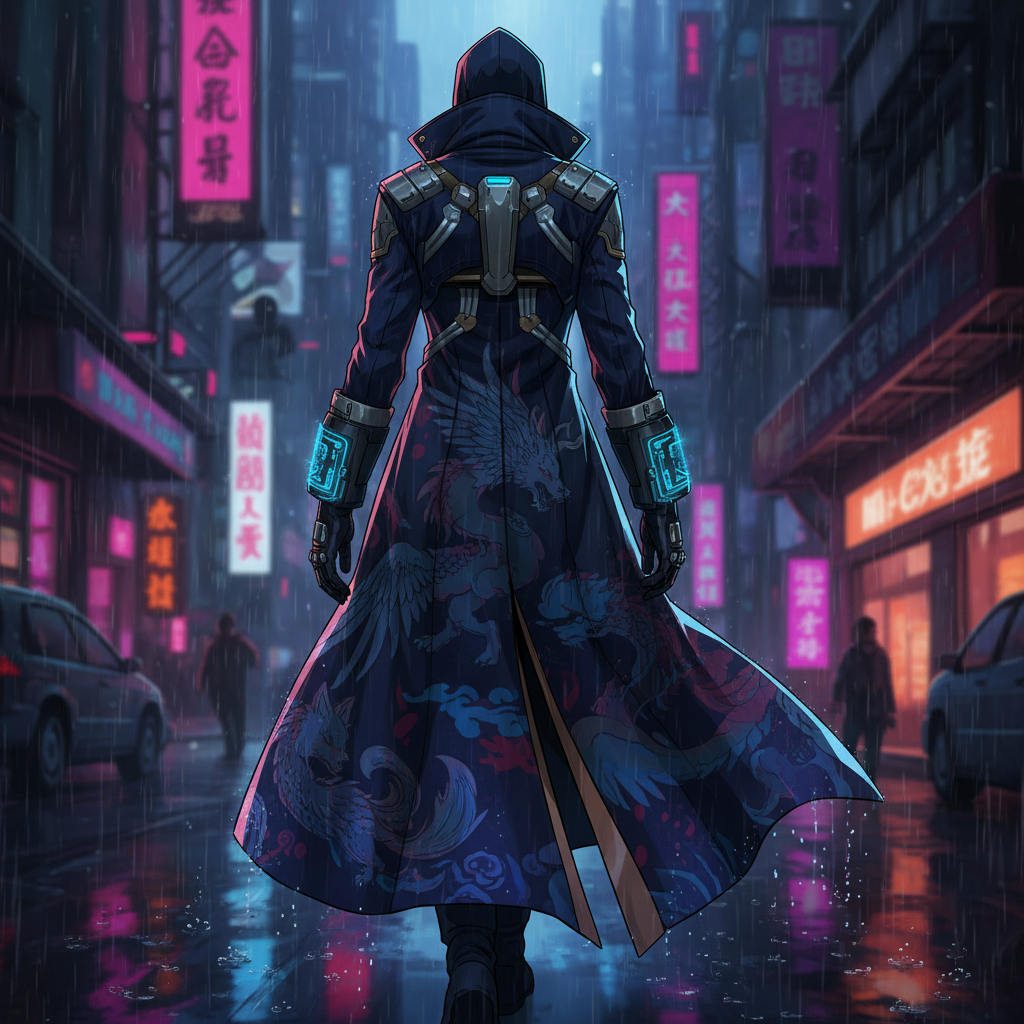 一款融合赛博格美学的长款风衣,廓形凌厉,采用高科技面料,表面隐约可见山海异兽的暗纹,兼具未来感与古典韵味。