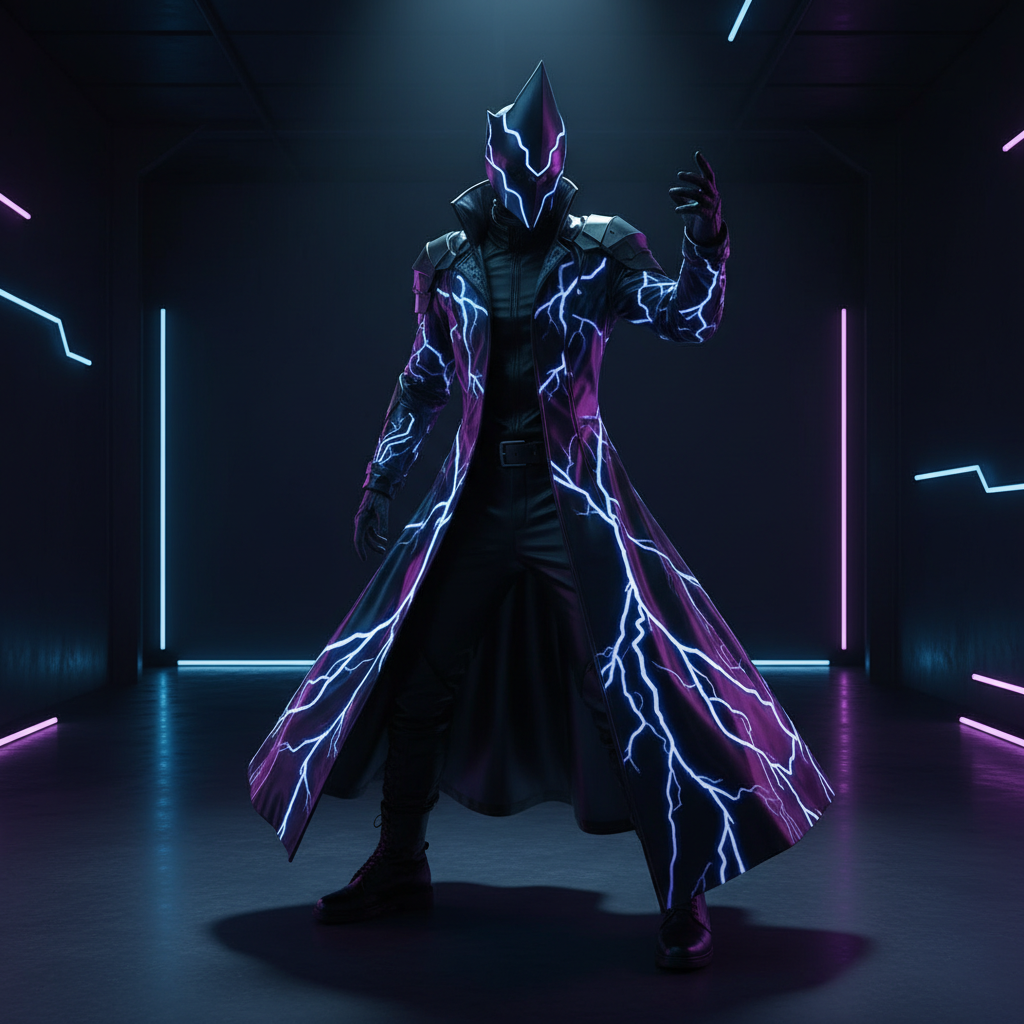 此作品以画廊黑盒的肃穆感为基调,融合了赛博朋克与和风元素,展现未来科技与传统美学的碰撞,设计独特的雷纹披风式长外套。