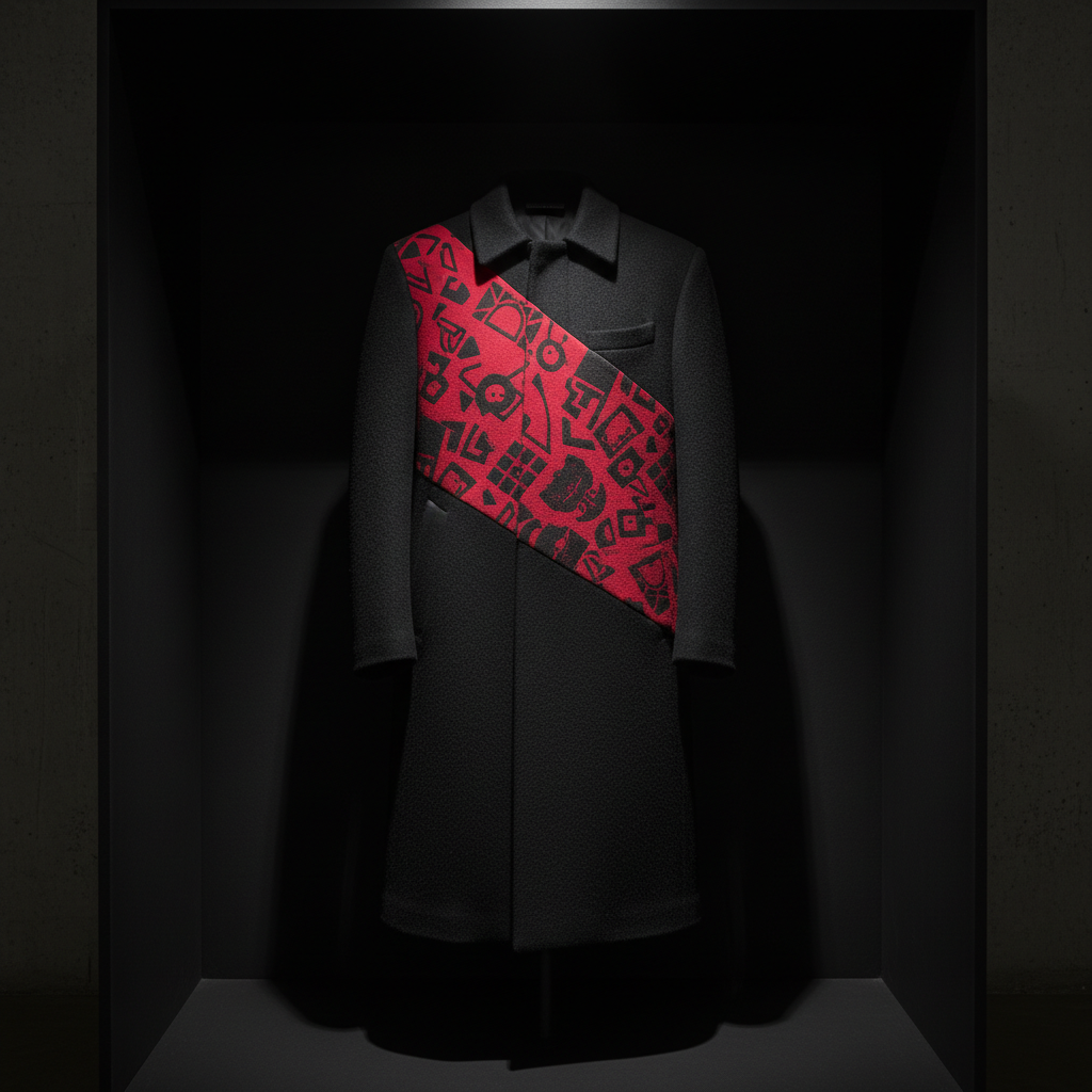 本作品将传统的格栅化工艺与流行文化的抽象纹理相结合,黑色为主的调色板中点缀着高饱和的红色,展现出强烈的戏剧效果。披风式外搭和收束腰线的设计,赋予了作品一种独特的秀场感。质感丰富的哑光皮和羊毛呢材质,营造出深邃的阴影层次。