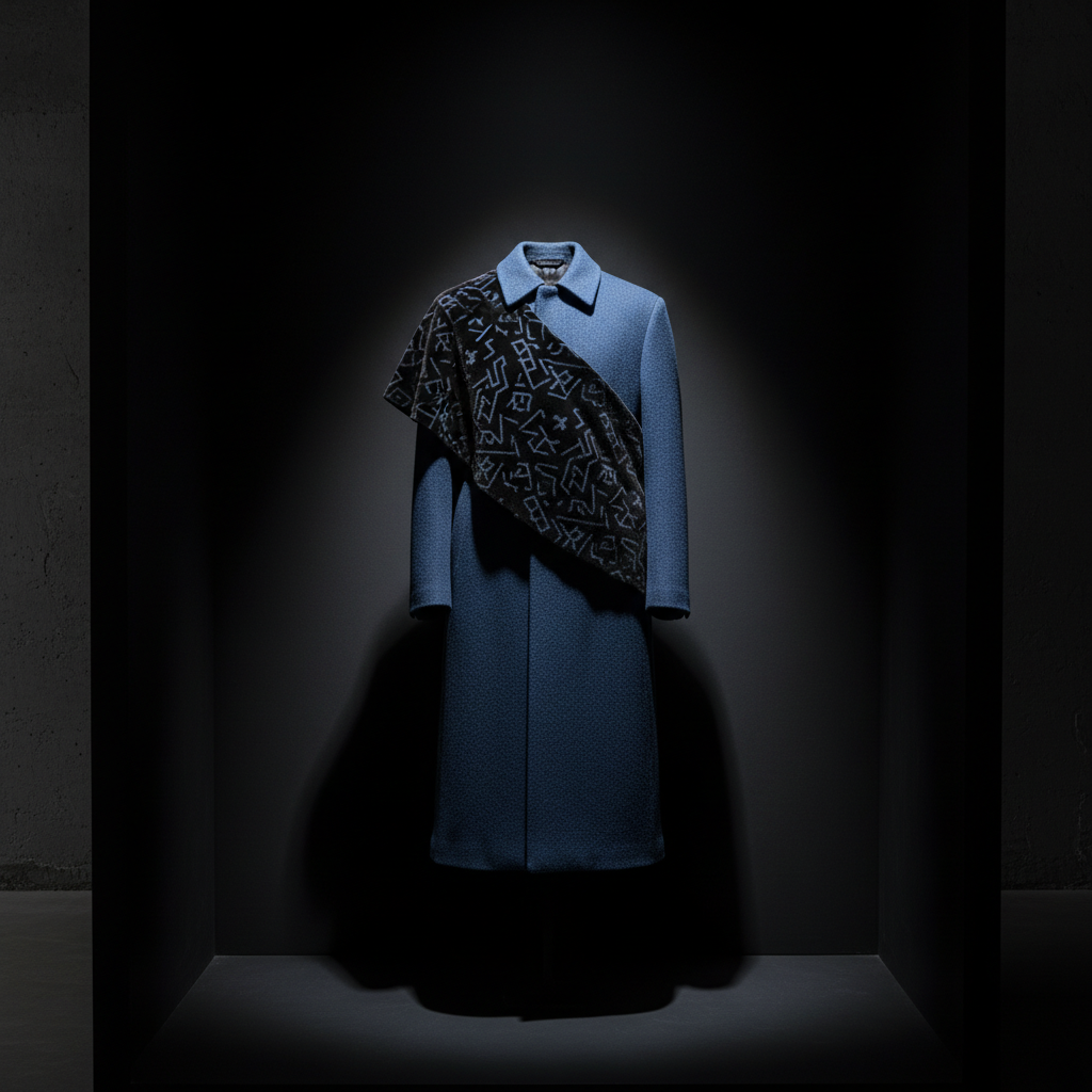 本作品以蓝色为主,融合了传统的暗纹工艺和流行文化的抽象符号,展现出一种独特的现代感。收束腰线和披风式外搭的设计,赋予了作品一种流行的秀场感。质感丰富的羊毛呢和重磅真丝材质,营造出深邃的阴影层次。