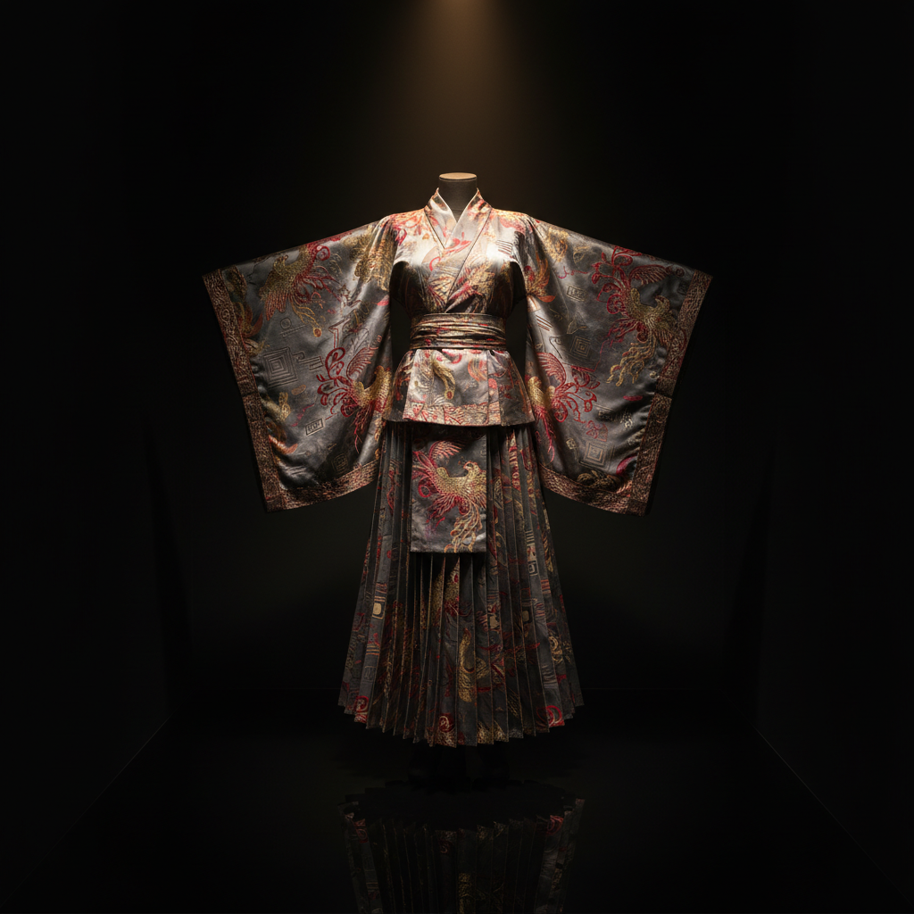 以凤凰为主题的舞蹈服,采用传统中国织锦工艺表现的凤凰图案,炭灰色和红色丝绸面料上精致的织锦,展现流行文化的抽象纹理和符号 不讲角色,只讲质感与节奏。