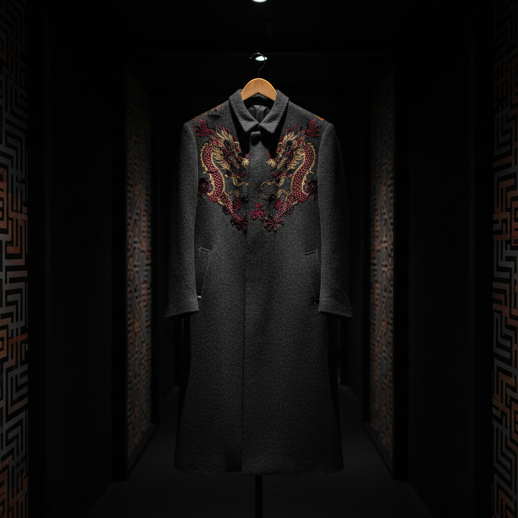 用龙做暗纹节拍,传统中国暗纹藏在边缘的聚光里;丝毛混纺把黑与炭灰做出层次。适合城市夜行,把“权力与尊贵”压成一个干净的符号。 不讲角色,只讲质感与节奏。