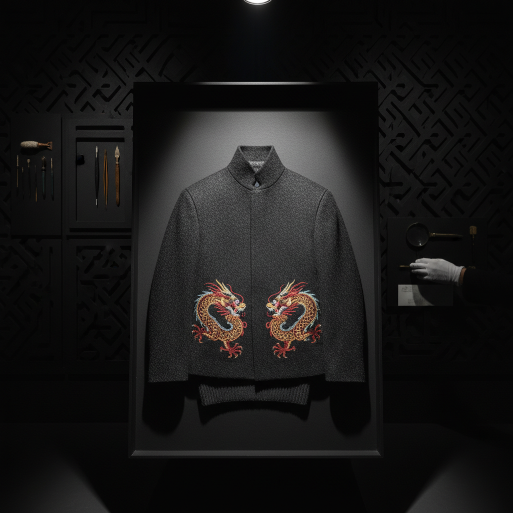 来自中国的龙被抽象成纹理,不出现任何角色;传统中国暗纹只做一处点睛。丝毛混纺在高对比光线中更显质感,面向音乐节,让“权力与尊贵”像一束聚光一样准确。 不讲角色,只讲质感与节奏。