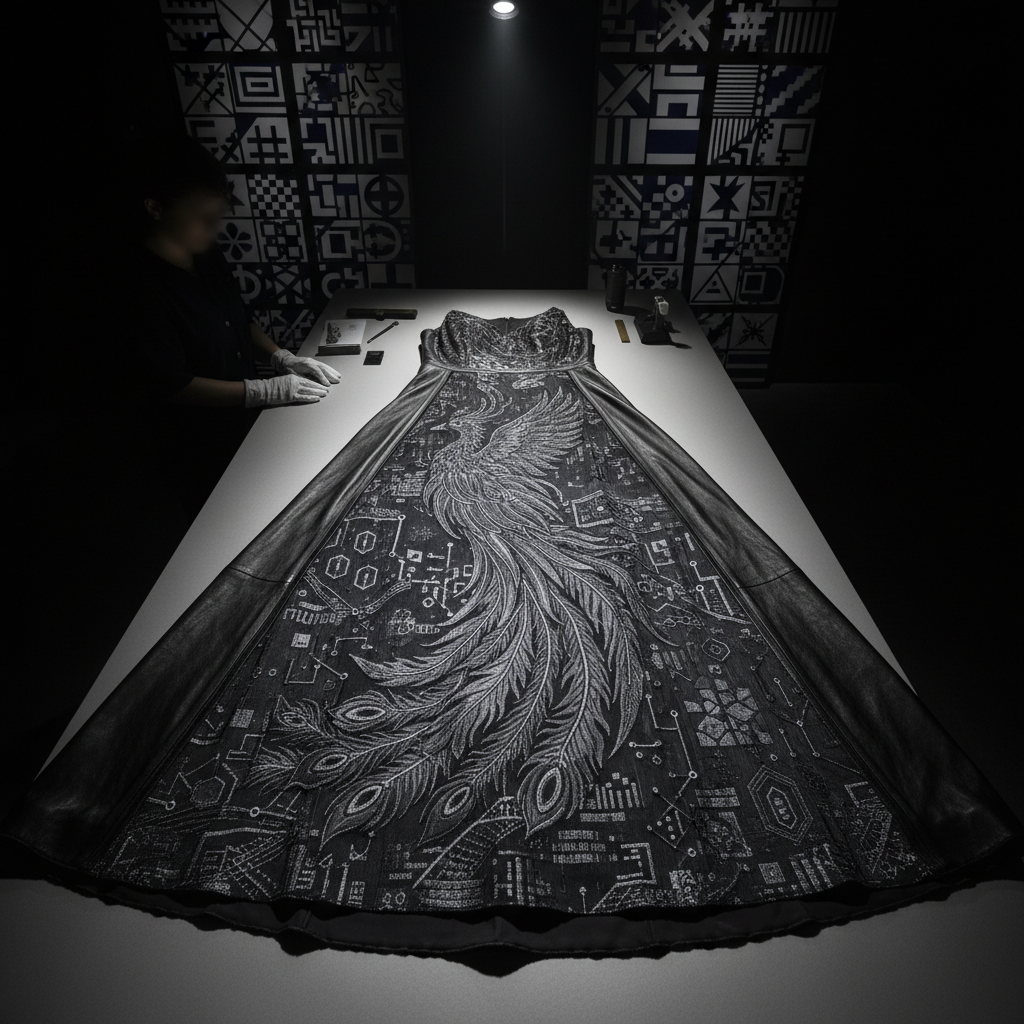 以传统的凤凰纹样为灵感,创作出一件具有浪漫气息的晚礼服。采用哑光皮和重磅真丝的材质,结合局部刺绣和提花工艺,营造出奢华感和层次感。黑色和炭灰色的主色调中,点缀以红色高饱和色,彰显出动漫风格的独特魅力。 不讲角色,只讲质感与节奏。