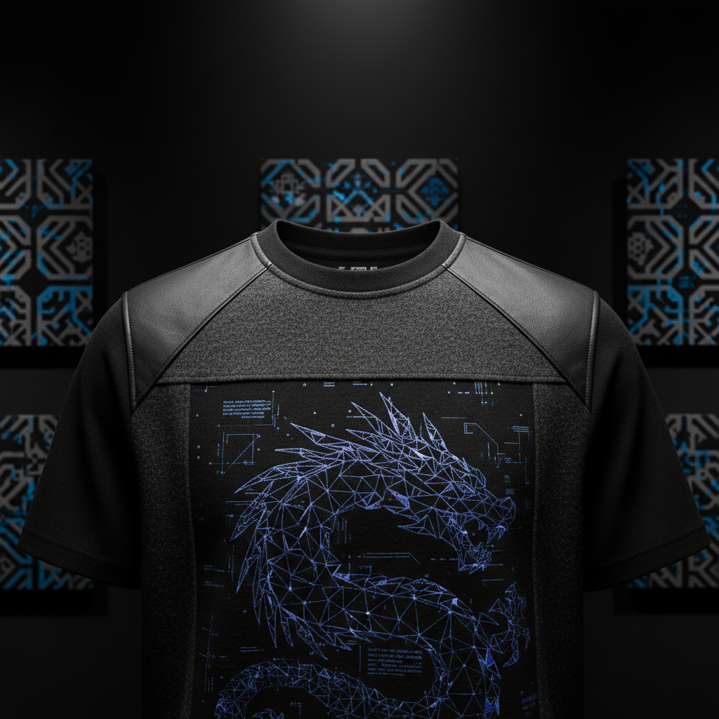以传统的龙纹样为灵感,创作出一件具有动感的T恤。采用羊毛呢和哑光皮的材质,结合提花和暗纹工艺,营造出层次感和质感。黑色和炭灰色的主色调中,点缀以蓝色高饱和色,彰显出动漫风格的独特魅力。 不讲角色,只讲质感与节奏。