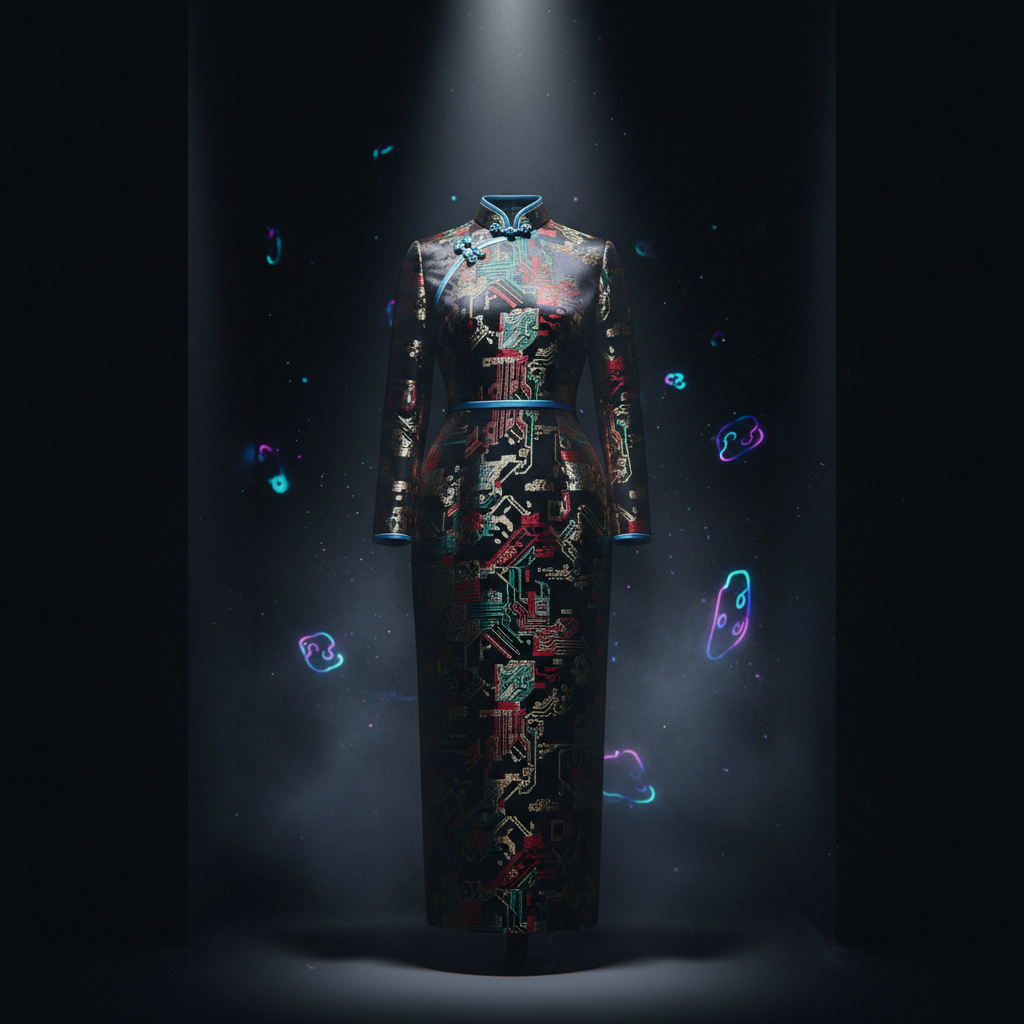 用中国传统牡丹纹做暗纹节拍,传统中国织锦藏在边缘的聚光里;真丝/醋酸把黑与炭灰做出层次。适合聚会合影,把“美丽与珍贵”压成一个干净的符号。 不讲角色,只讲质感与节奏。