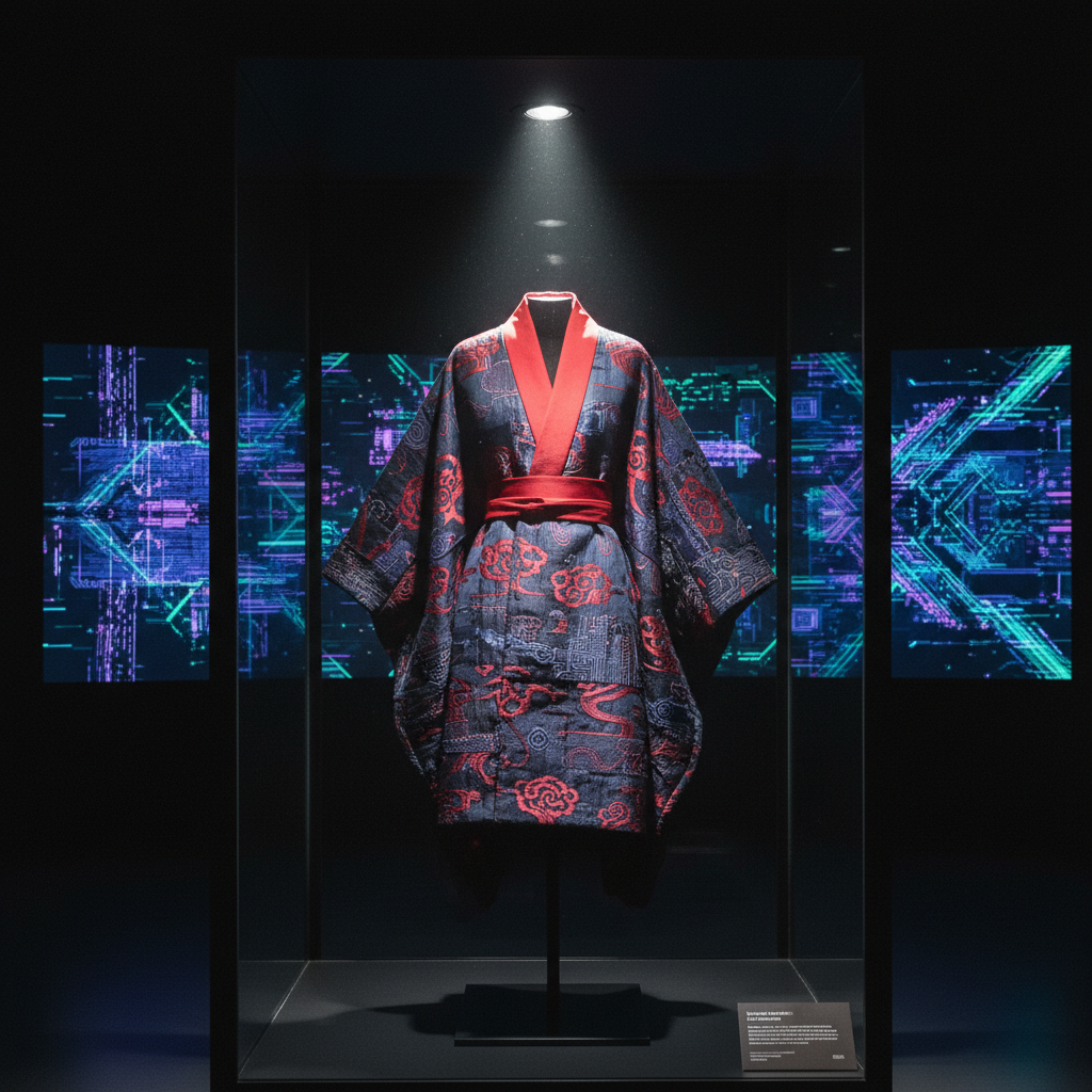 融合传统中国纹样与现代web3风格的宽松外套,采用黑色重磅真丝和炭灰色羊毛呢,点缀红色高饱和色块,展现抽象纹理与符号的动漫风格 不讲角色,只讲质感与节奏。