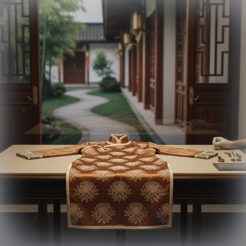 以菊花图案为主题,结合现代设计元素的旗袍作品,采用羊毛混纺面料,精致的暗纹提花工艺,体现出独特的立体感和流线型,传承着中国传统旗袍的历史文化寓意 把一段城市的光影,收进一粒盘扣的分寸里。
