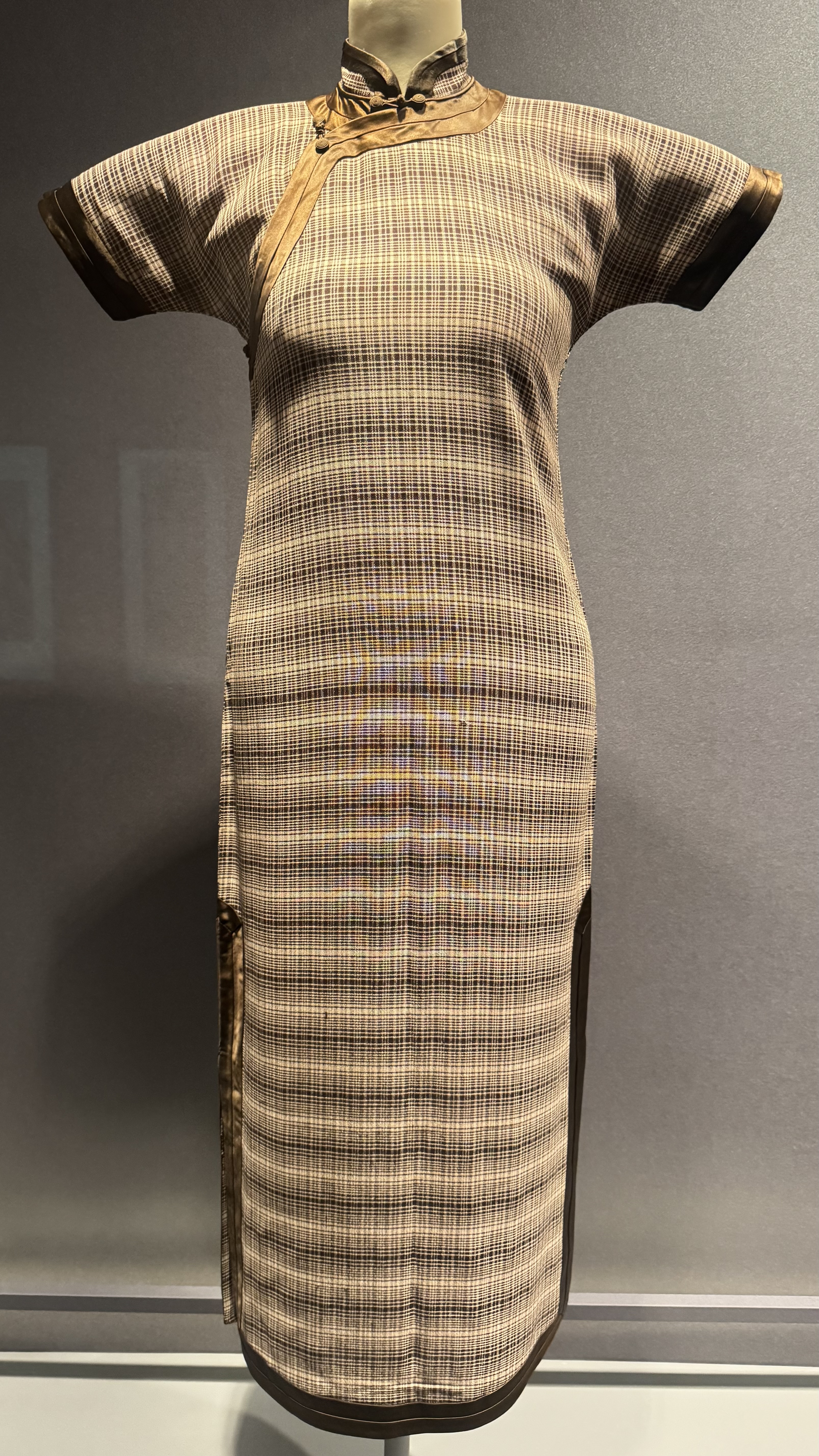 把这件海派旗袍分享给你|《米黄地棕色细格纹麻布旗袍 Misty Yellow Linen Qipao with Brown F…