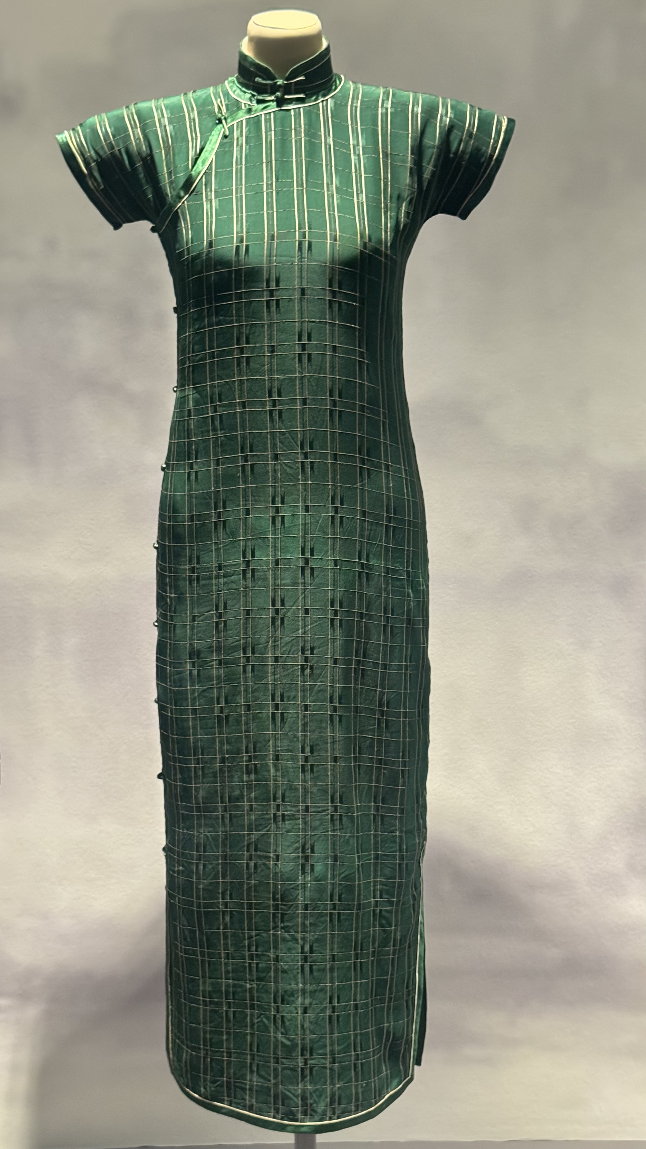 随着女性步入学堂学习与进入职业领域,旗袍亦焕发新的时代气质。这件旗袍面料以墨绿色为地,由金线和米黄线织出疏密变化的格纹,格内填入变化小方格纹提花,形成理性与律动节奏,在严谨的秩序感中又有光…