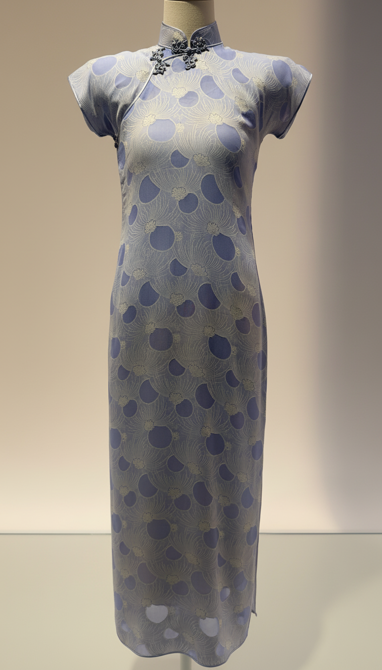 把这件海派旗袍分享给你|《浅雪青色地白菊花纹提花剪花绸旗袍 Pale Lilac Jacquard Clipped Silk …