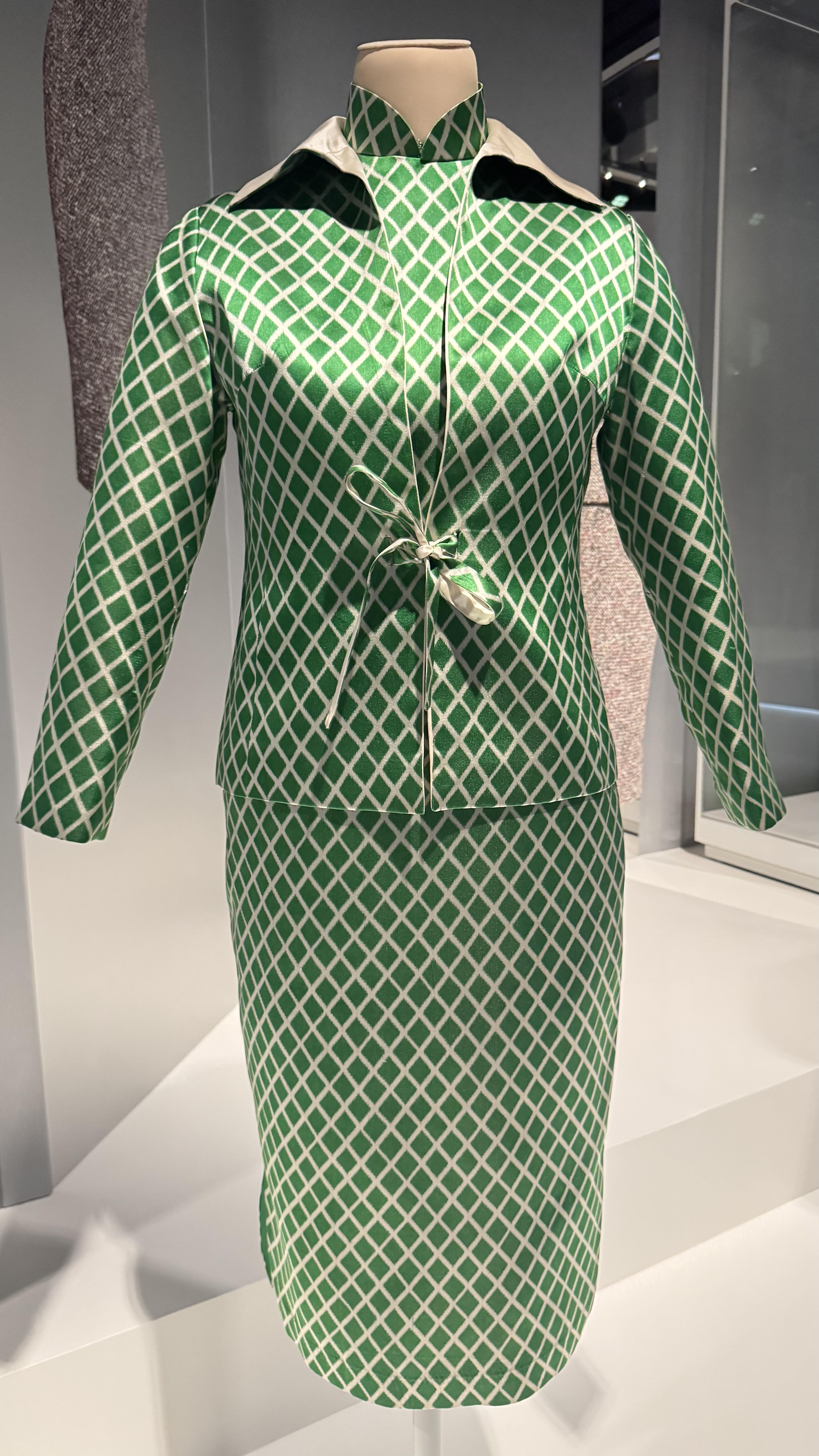 20世纪80-90年代 1980s-1990s 上海博物馆藏 2021年贝洽女士捐赠 Collection of the Shanghai Museum Gift of Ms. Patricia Pei, 2021 这套旗袍套装包含修身旗袍与西式外套。翻领外套双面可穿,实用别致,一面原白,一面延续…