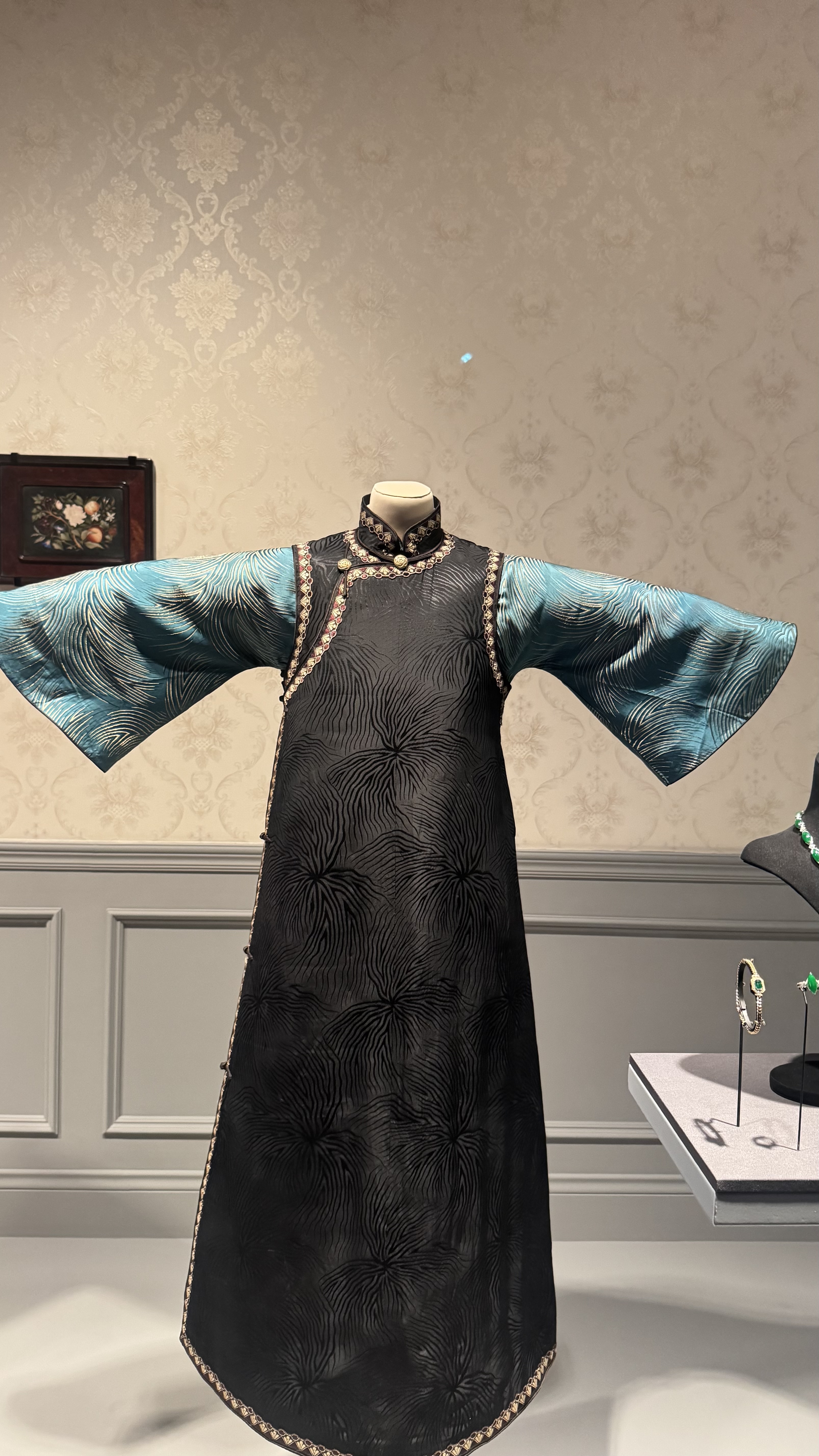 把这件海派旗袍分享给你|《湖蓝色地米蕭脉络纹提花網倒大袖衫 Aquamarine Bell-Sleeved jacquard …