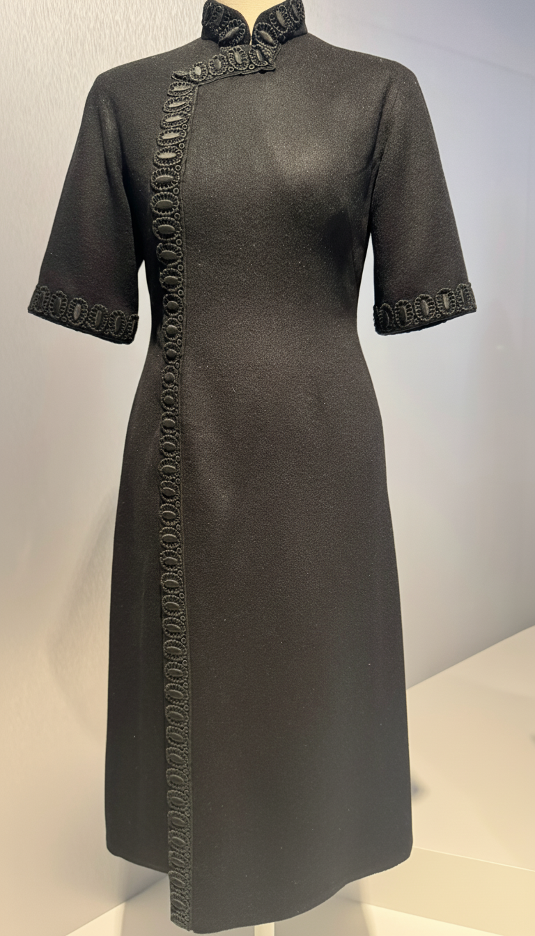 20世纪70年代 1970s 上海博物馆藏 2021年贝洽女士捐赠 Collection of the Shanghai Museum Gift of Ms. Patricia Pei, 2021 这款“直襟旗袍”以创新剪裁重塑传统,立领、装袖、收腰、衣襟直通下摆的独特设计塑造出简约流畅的轮廓,更…
