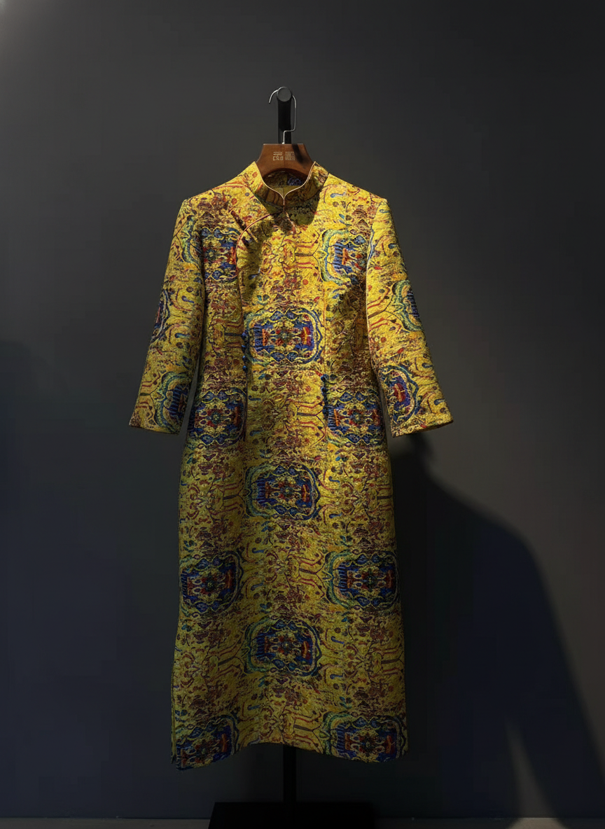 淡墨溢彩的金黄色与砖红色交织,生成了一道极具张力的视觉。几何团花纹样层层开启,宛若宫廷绣工的气派。 旗袍领口处的盘口立领,奠定了整个作品的骨架感。它不仅最能体现“软雕塑”的建筑美学,更印证了宋锦特有的质地坚韧。整件作品堪称神品。 穿在身上,几何团花纹样与身上交相辉映,似一件静态的金绣。 体现美学与功…