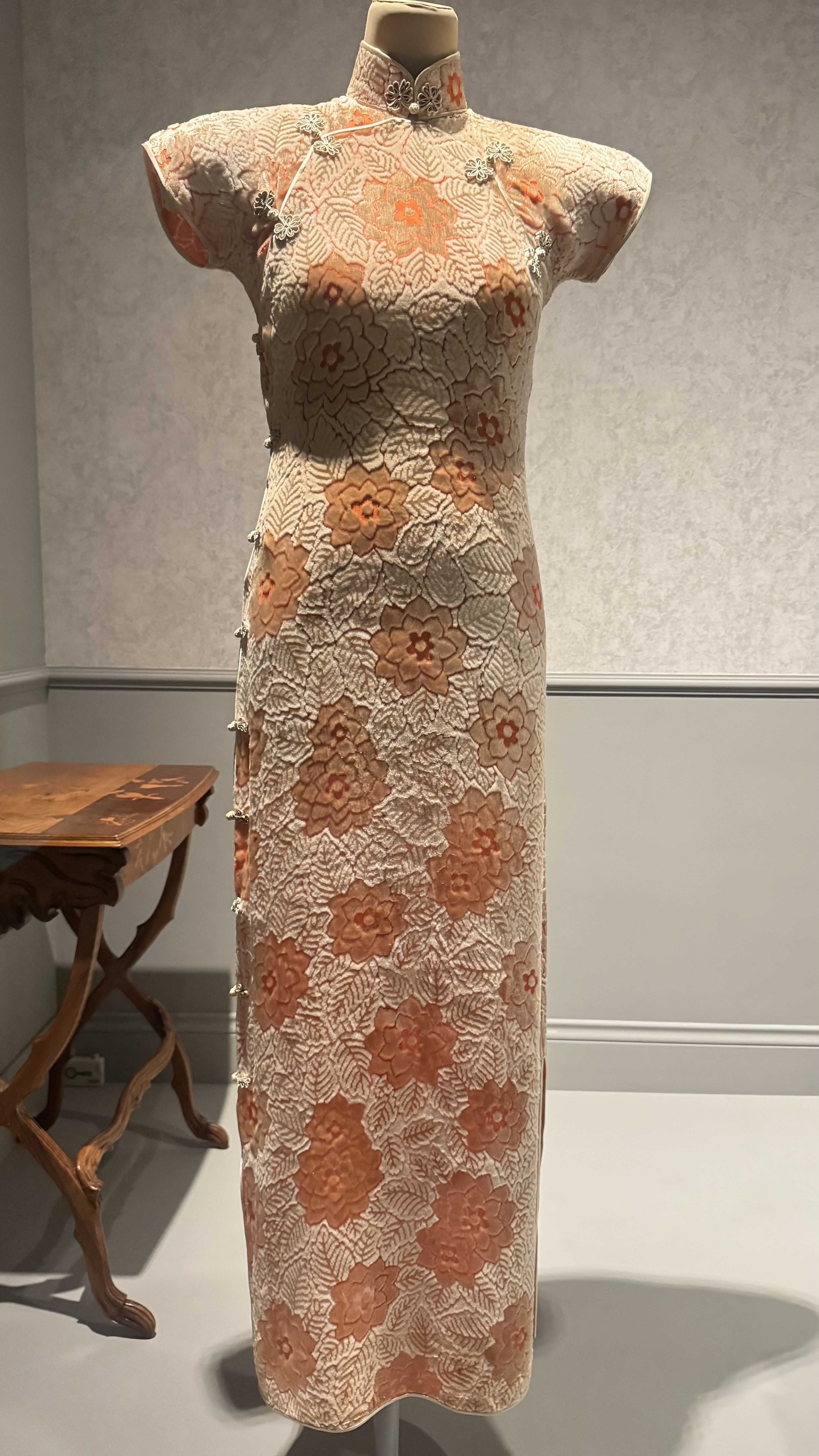 20世纪30年代 张信哲先生收藏 1930s Collection of Mr. Jeff Chang 中高领短袖旗袍解放了脖颈与手臂,活动更显自由。 八字襟设计修身对称,镂空盘花纽与烂花绒工艺相映成趣。其橘红地料上的纹样制作极为精湛:先以酸剂蚀出轮廓,再于绒面精准绘染浅褐花色,形成丰富立体的层次。整体既洋…