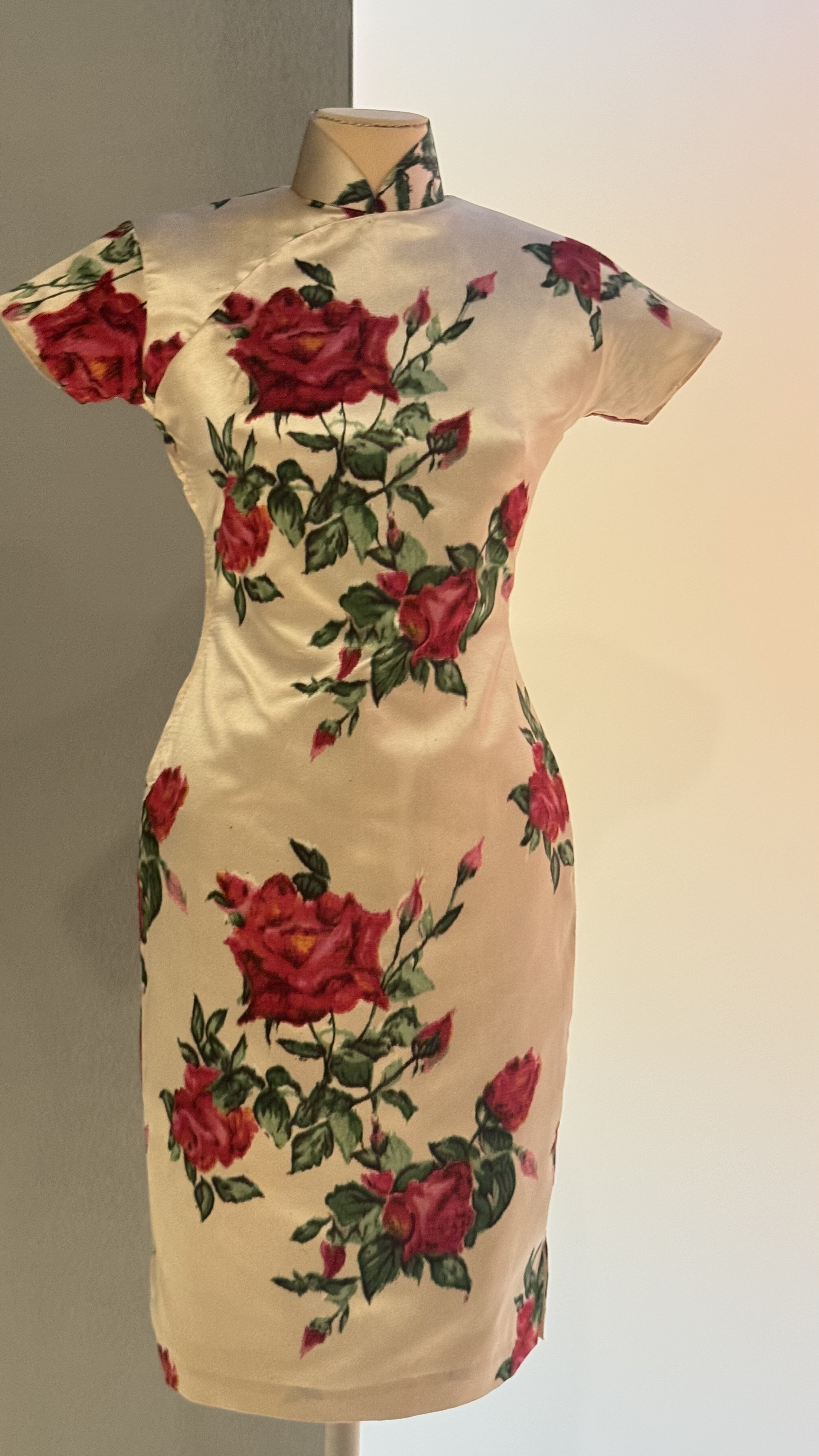 此为20世纪50至60年代典型港式旗袍样式:长度及膝,中高领、短装袖,采用自然肩线与立体胸…