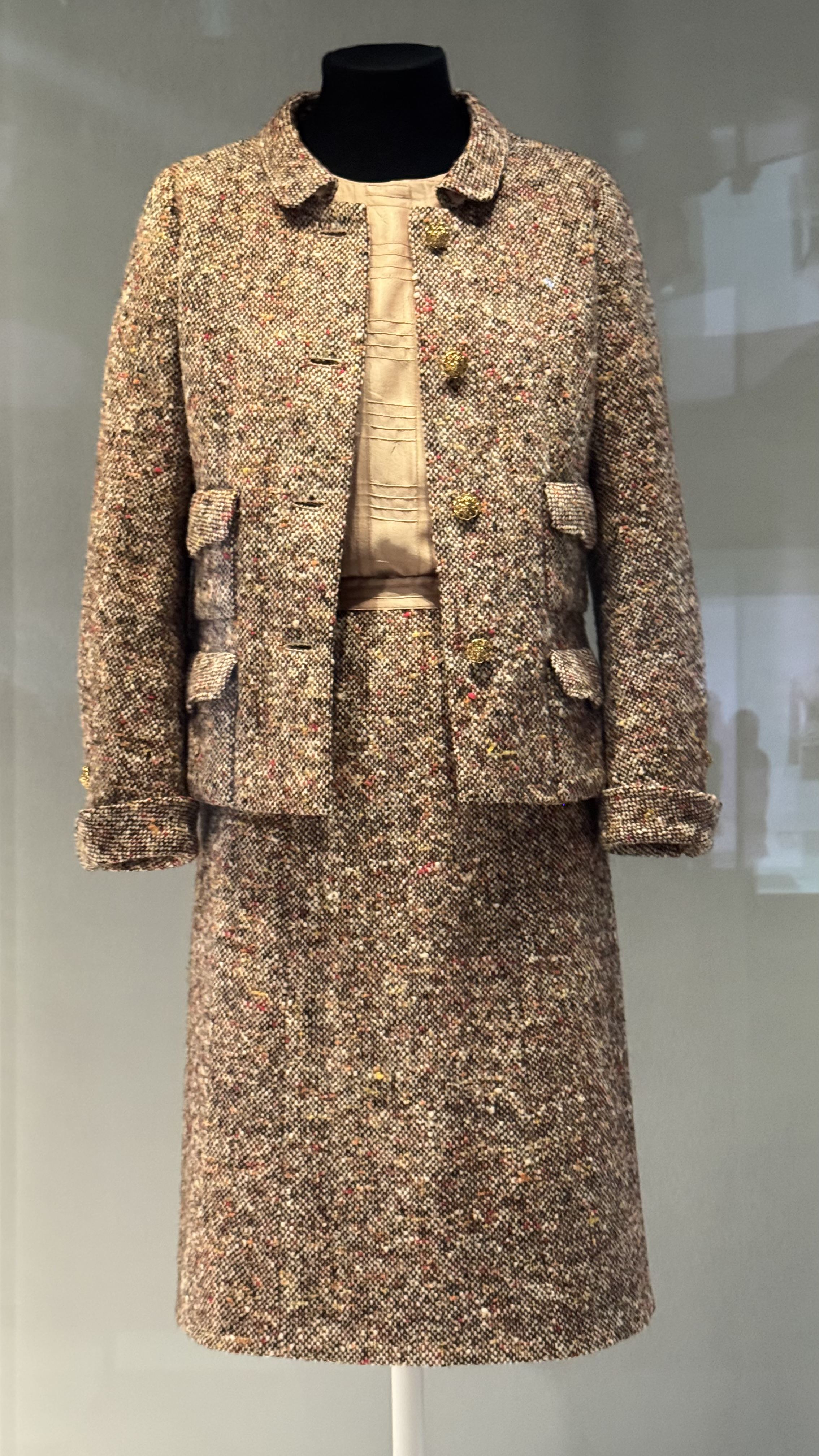 1964/65年秋冬高级订制嘉柏丽尔 香奈儿设计 Haute Couture Fall-Winter 1964/65 Gabrielle Chanel 巴黎香奈儿典藏 Patrimoine de CHANEL, Paris 这套为香风经典三件套设计:麻色粗花呢外套与半身裙,内搭米白色丝质针织衫,以明线缝制…