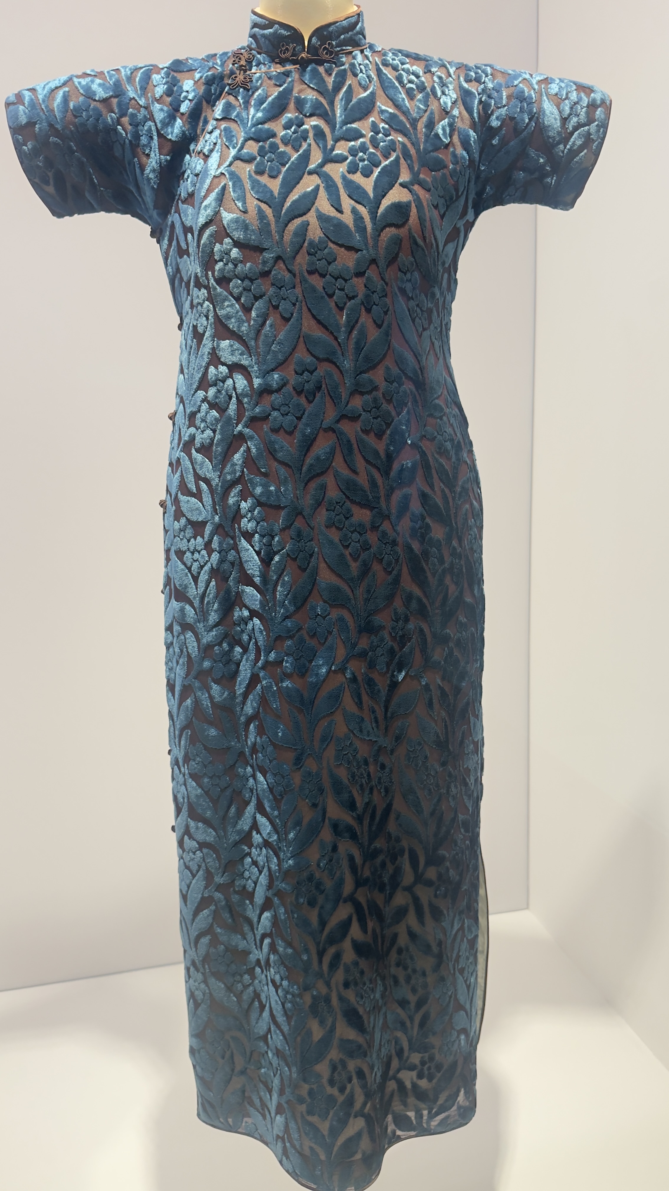 此件旗袍体现出裁缝的智慧:中袖与腋下宽松设计有效遮饰上臂、优化腰胸比例。烂花绒面料设计独具回心:微透的深棕乔其纱地如暮色轻笼,视觉上收缩修饰身形,向上生长的蓝色绒花图案设计引导视线,在视觉上拉长线条,令穿着…