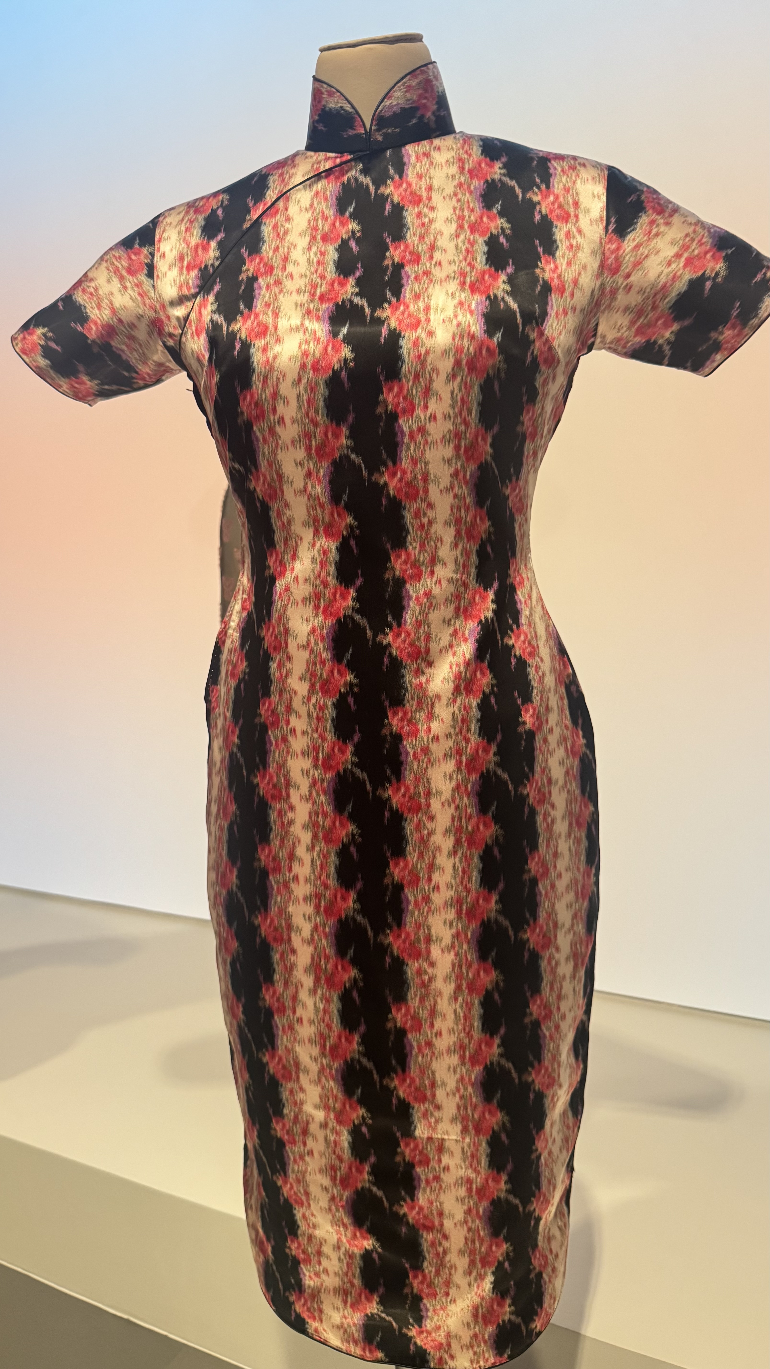 把这件海派旗袍分享给你|《黑白纵条红玫瑰纹印经缎旗袍 Warp-Printed Satin Qipao with Vertic…